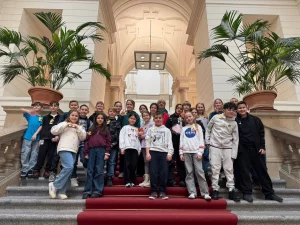 Als wir drinnen waren, sahen wir links und rechts zwei große Treppen mit jeweils einem roten Teppich. Überall an den Wänden hingen Wandteppiche, die Bilder des Abgeordnetenhauses aus den Jahren 1899 und 2024 zeigten. Wir haben dann eine Führung durch das Gebäude bekommen. Zuerst wurde uns erklärt, was uns alles erwarten würde und danach ging es auch schon los. Wir waren auf der Besuchertribüne im großen Plenarsaal der Politiker und durften sogar in die Kantine schauen.